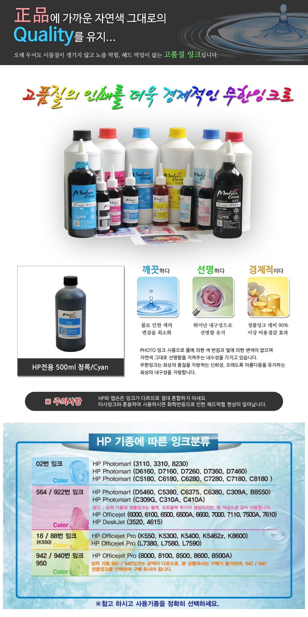 막힘없는 충전용500ml HP전용잉크청록Cyan